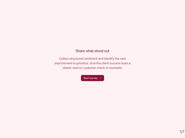 A survey for the client success team to gather feedback around customer check-in workflows. Capture structured sentiment, friction, and improvement ideas in a polished feedback flow.