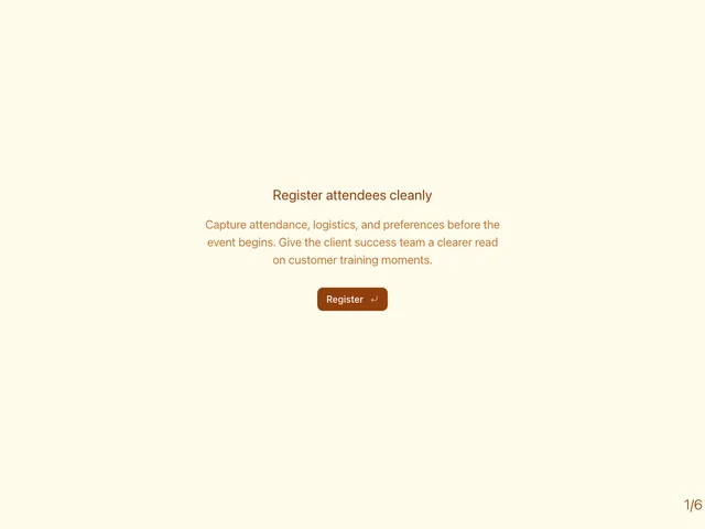 A form for the client success team to run events around customer training workflows. Collect attendee details, logistics, and session needs in one polished registration flow.