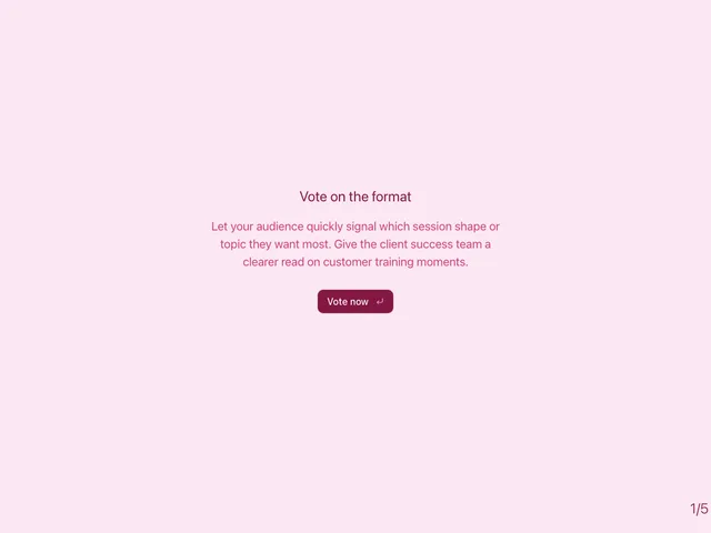 A poll for the client success team to run events around customer training workflows. Use a quick poll to choose topics, formats, and priorities before an event goes live.