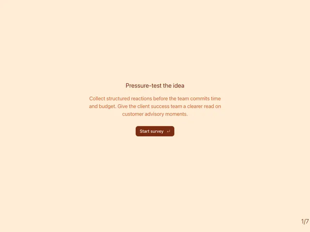 A survey for the client success team to test ideas around customer advisory workflows. Use a survey to learn whether a concept feels valuable, clear, and worth deeper testing.