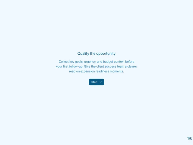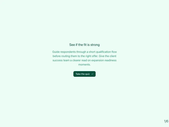 A quiz for the client success team to win more business around expansion readiness workflows. Turn top-of-funnel interest into clearer sales signals with a short qualification quiz.