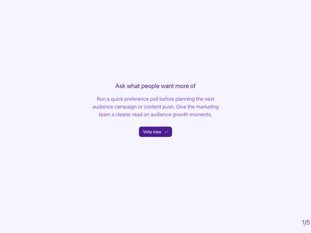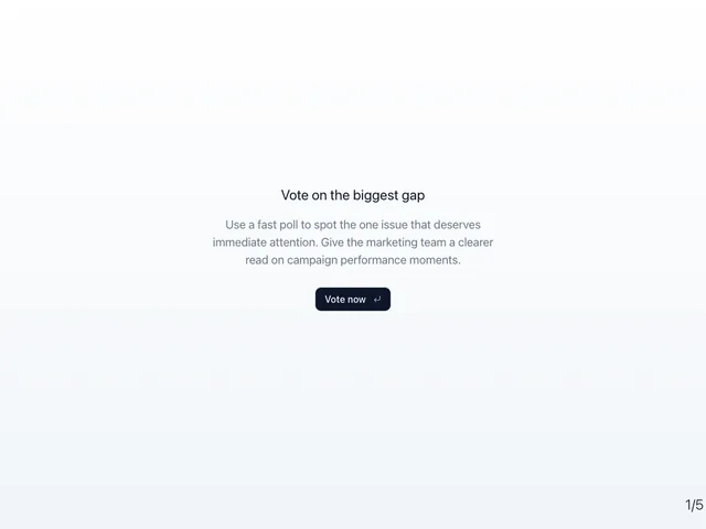 A poll for the marketing team to gather feedback around campaign performance workflows. Run a lightweight poll to surface the strongest sentiment signal from a specific moment.