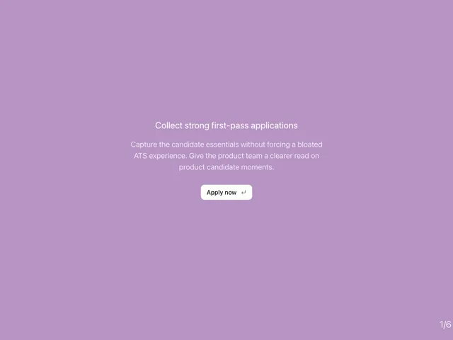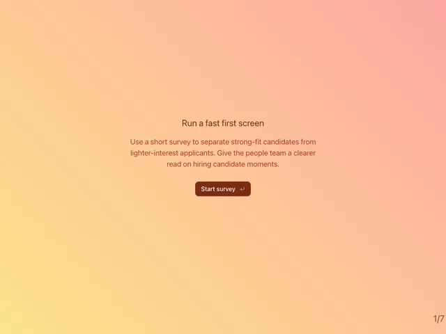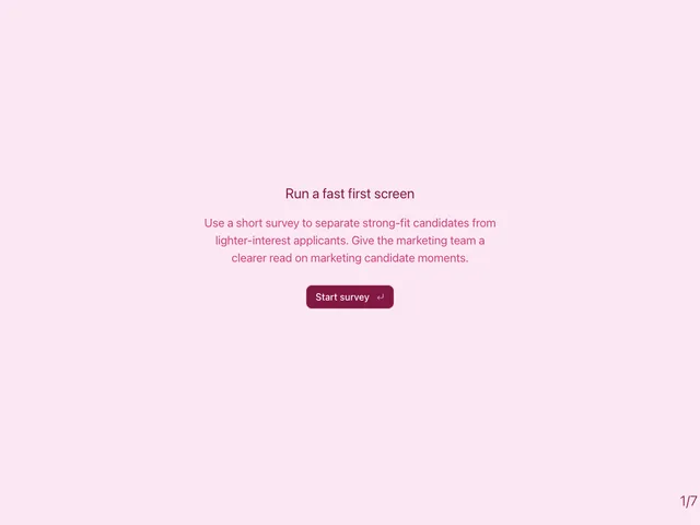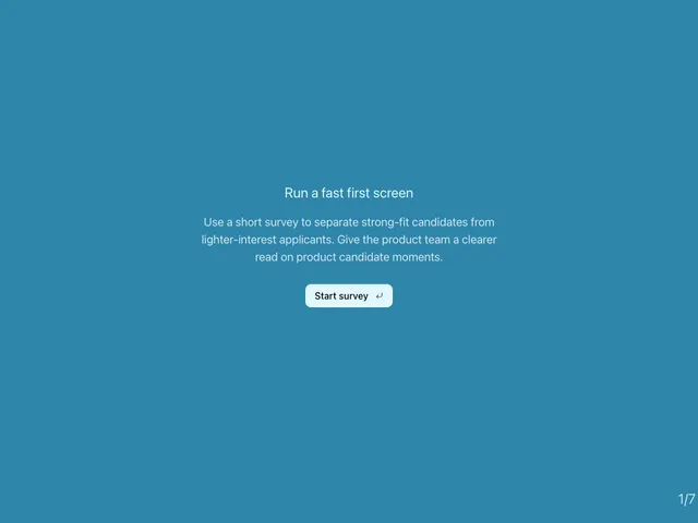 A survey for the product team to hire talent around product candidate workflows. Use a structured survey to understand motivation, confidence, and fit before scheduling time.