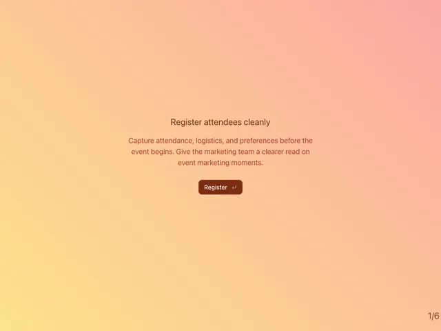 A form for the marketing team to run events around event marketing workflows. Collect attendee details, logistics, and session needs in one polished registration flow.
