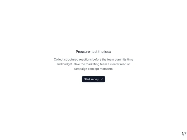 A survey for the marketing team to test ideas around campaign concept workflows. Use a survey to learn whether a concept feels valuable, clear, and worth deeper testing.