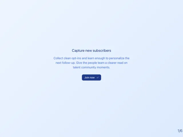 A form for the people team to grow your audience around talent community workflows. Collect opt-ins, audience context, and preferences without making signup feel heavy.