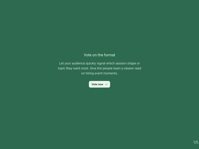 A poll for the people team to run events around hiring event workflows. Use a quick poll to choose topics, formats, and priorities before an event goes live.