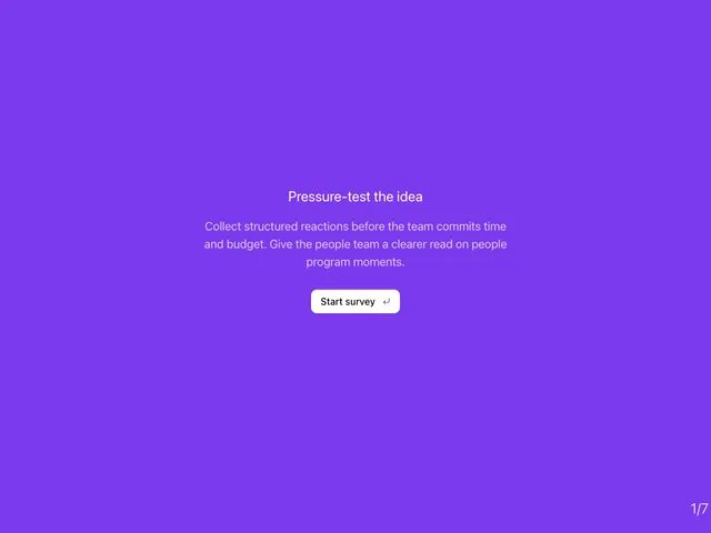 A quiz for the people team to test ideas around people program workflows. Turn concept testing into a short quiz that surfaces readiness, fit, and missing inputs.