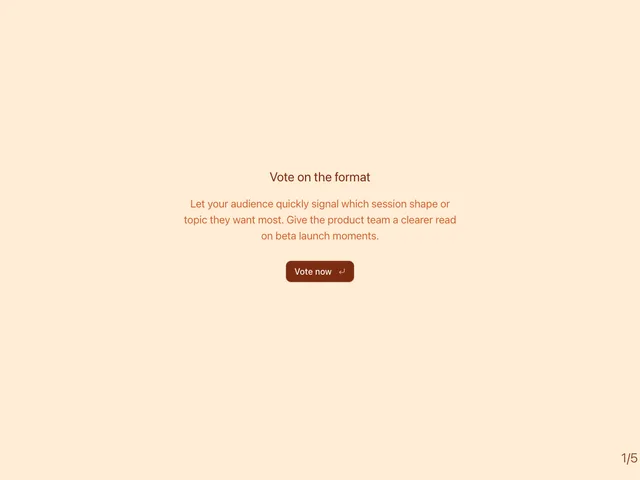 A poll for the product team to run events around beta launch workflows. Use a quick poll to choose topics, formats, and priorities before an event goes live.