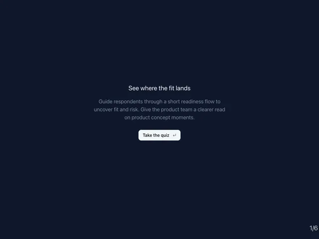 A quiz for the product team to test ideas around product concept workflows. Turn concept testing into a short quiz that surfaces readiness, fit, and missing inputs.