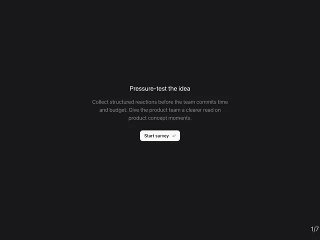 A survey for the product team to test ideas around product concept workflows. Use a survey to learn whether a concept feels valuable, clear, and worth deeper testing.