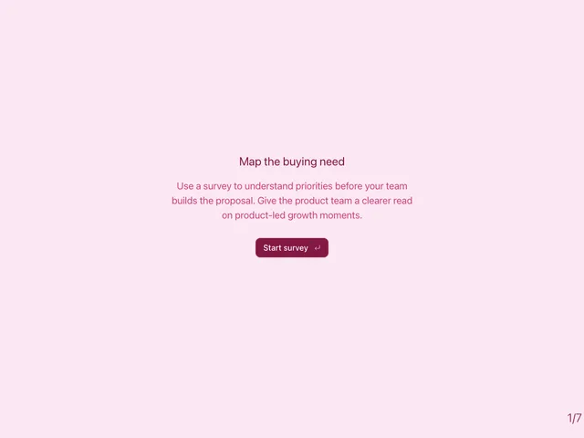 A survey for the product team to win more business around product-led growth workflows. Understand urgency, fit, and buying criteria before the team sends the next proposal.