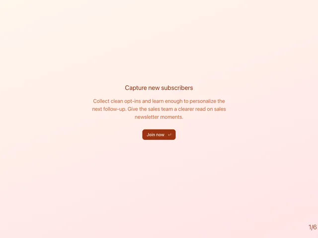 A form for the sales team to grow your audience around sales newsletter workflows. Collect opt-ins, audience context, and preferences without making signup feel heavy.