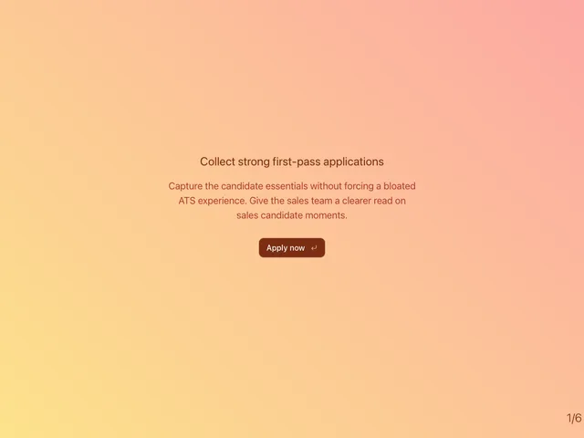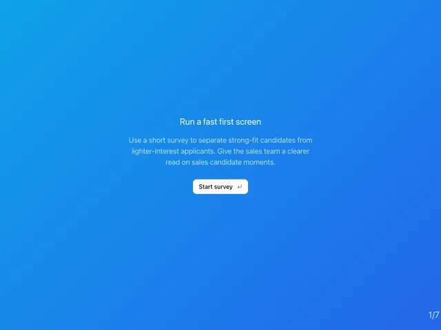 A survey for the sales team to hire talent around sales candidate workflows. Use a structured survey to understand motivation, confidence, and fit before scheduling time.
