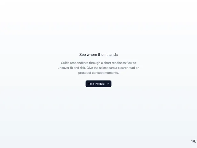 A quiz for the sales team to test ideas around prospect concept workflows. Turn concept testing into a short quiz that surfaces readiness, fit, and missing inputs.