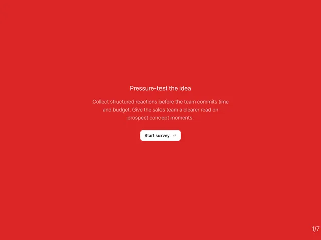 A survey for the sales team to test ideas around prospect concept workflows. Use a survey to learn whether a concept feels valuable, clear, and worth deeper testing.